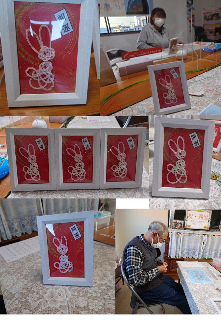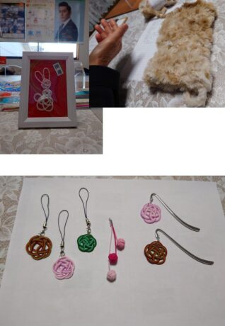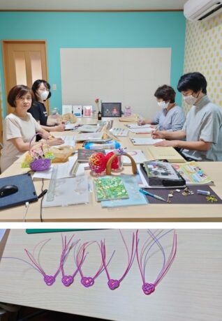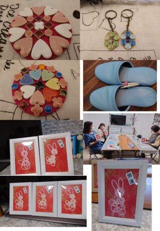 美濃焼タイルでコースターや鍋敷き、キーホルダーを作ったり、水引でスリッパの目印を結びました。