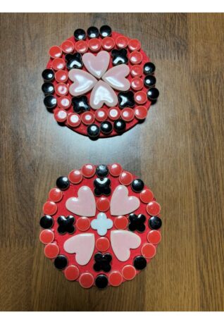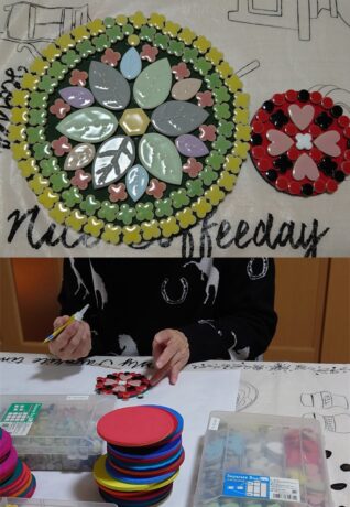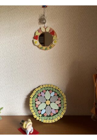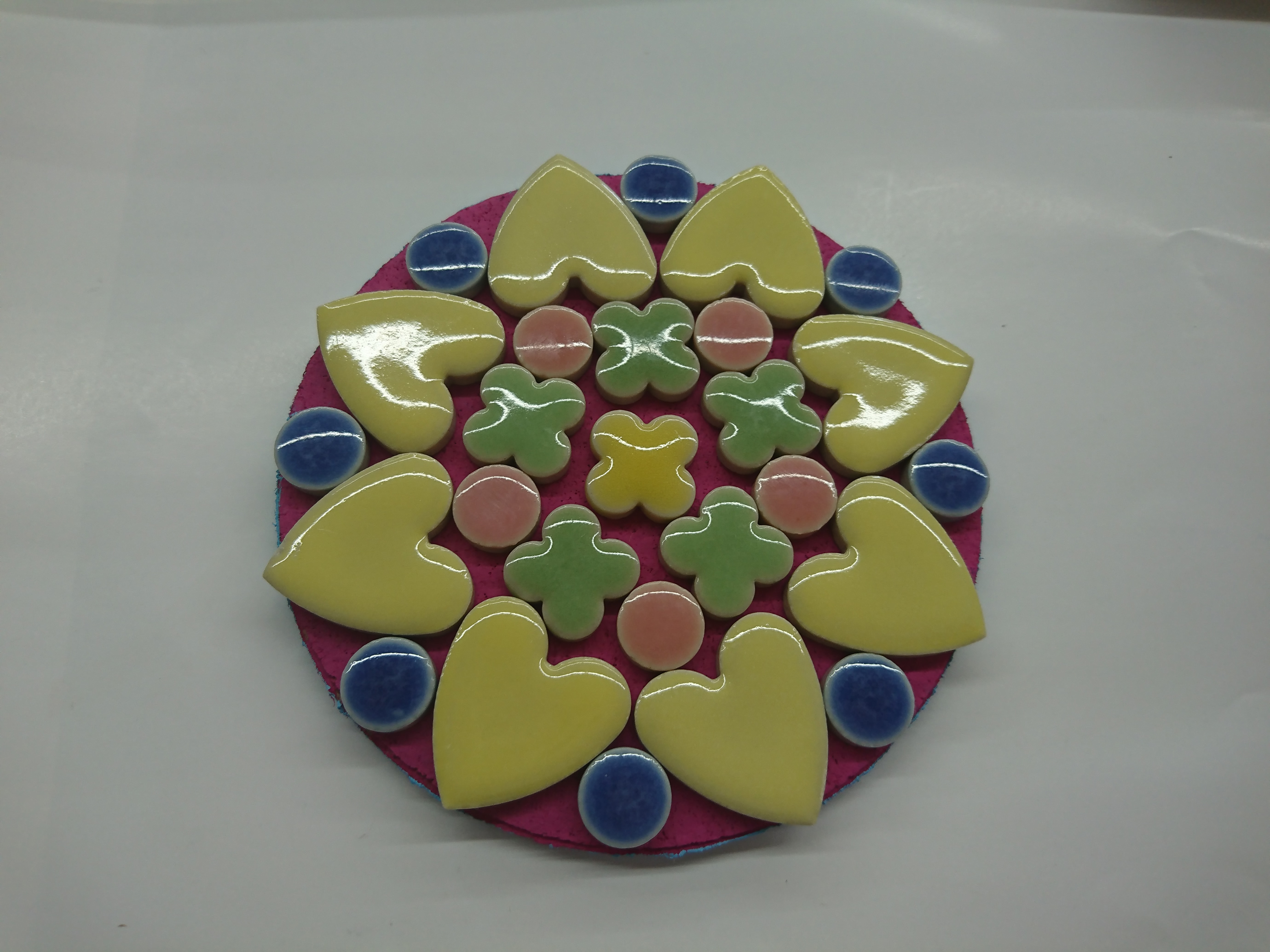 可愛いハートの美濃焼タイルでコースター作りやリーフのタイルで鍋敷き、縁起の良い八角の鏡などを作りました。