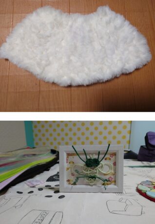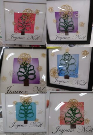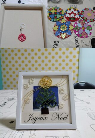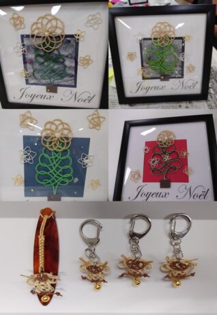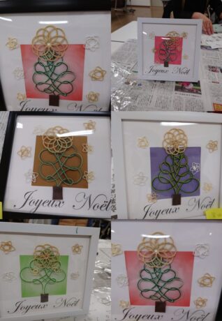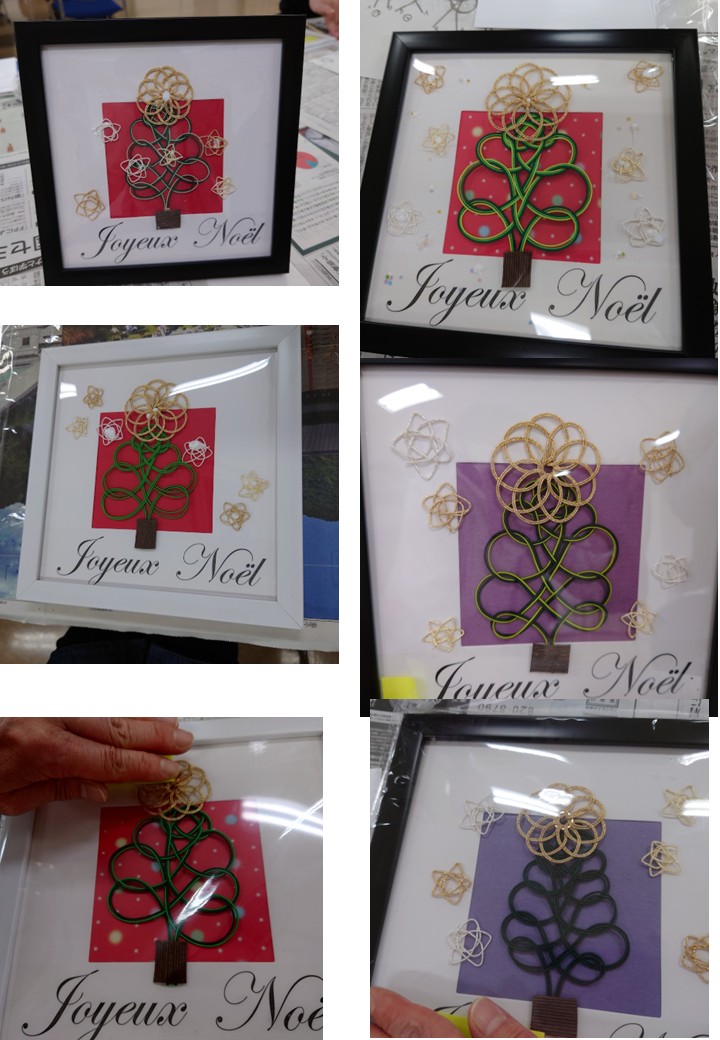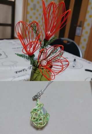 美濃焼タイルのコースターやふわふわ毛糸で編んだネックウォーマー、水引でクリスマスのフレームや干支の辰、傘マーカーを結んだりしました。